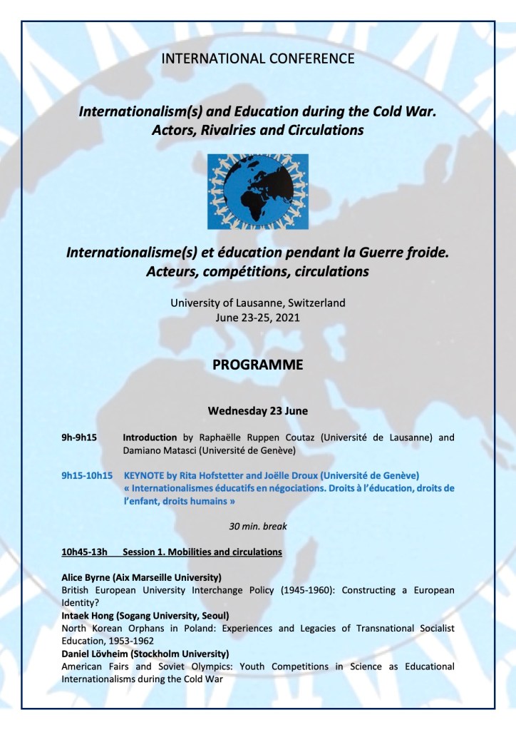 The final programme of the international conference Internationalism(s) and Education during the Cold War. Actors, Rivalries and Circulations (Lausanne, June 23-25, 2021) is now available.