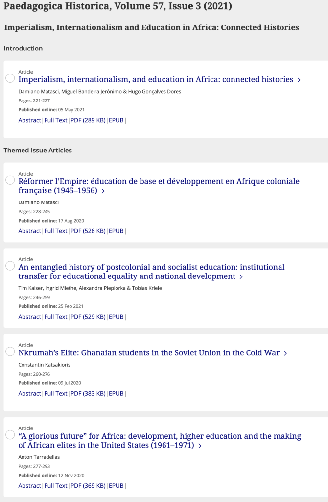 Internationalism, Imperialism, and Education in Africa: Connected Histories, Paedagogica Historica. International Journal of the History of Education, vol. 57, no 3, 2021.