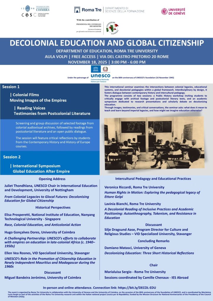 The international webinar series UNESCO’s Role in Post-War Educational Transformation and Decolonization is being organized by the Roma Tre University, University of Coimbra, and University of Geneva. The series will be held on march 26, april 14, and april 16, 2025, at 4:00 pm Rome Time (CET). Each session will feature two parallel panels, inviting participants to actively engage in critical dialogues concerning the multifaceted legacies of decolonization and the complex challenges posed by globalization, with a keen focus on fostering innovative approaches to knowledge production and cultural exchange.