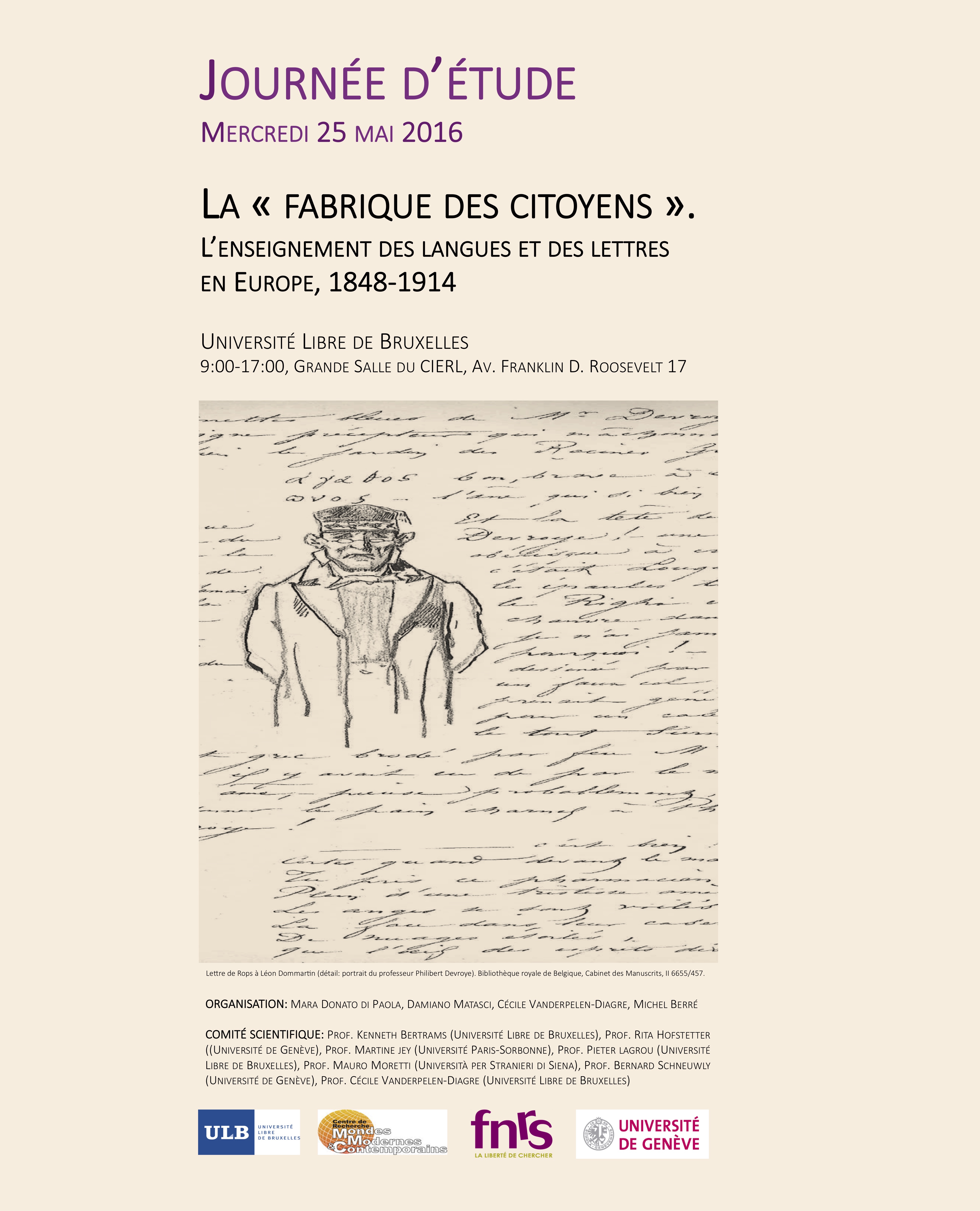 La « fabrique des citoyens ». L’enseignement des lettres et des langues en Europe au XIXème siècle, May 25, 2016, Université Libre de Bruxelles, co-organiser with Mara Donato di Paola.