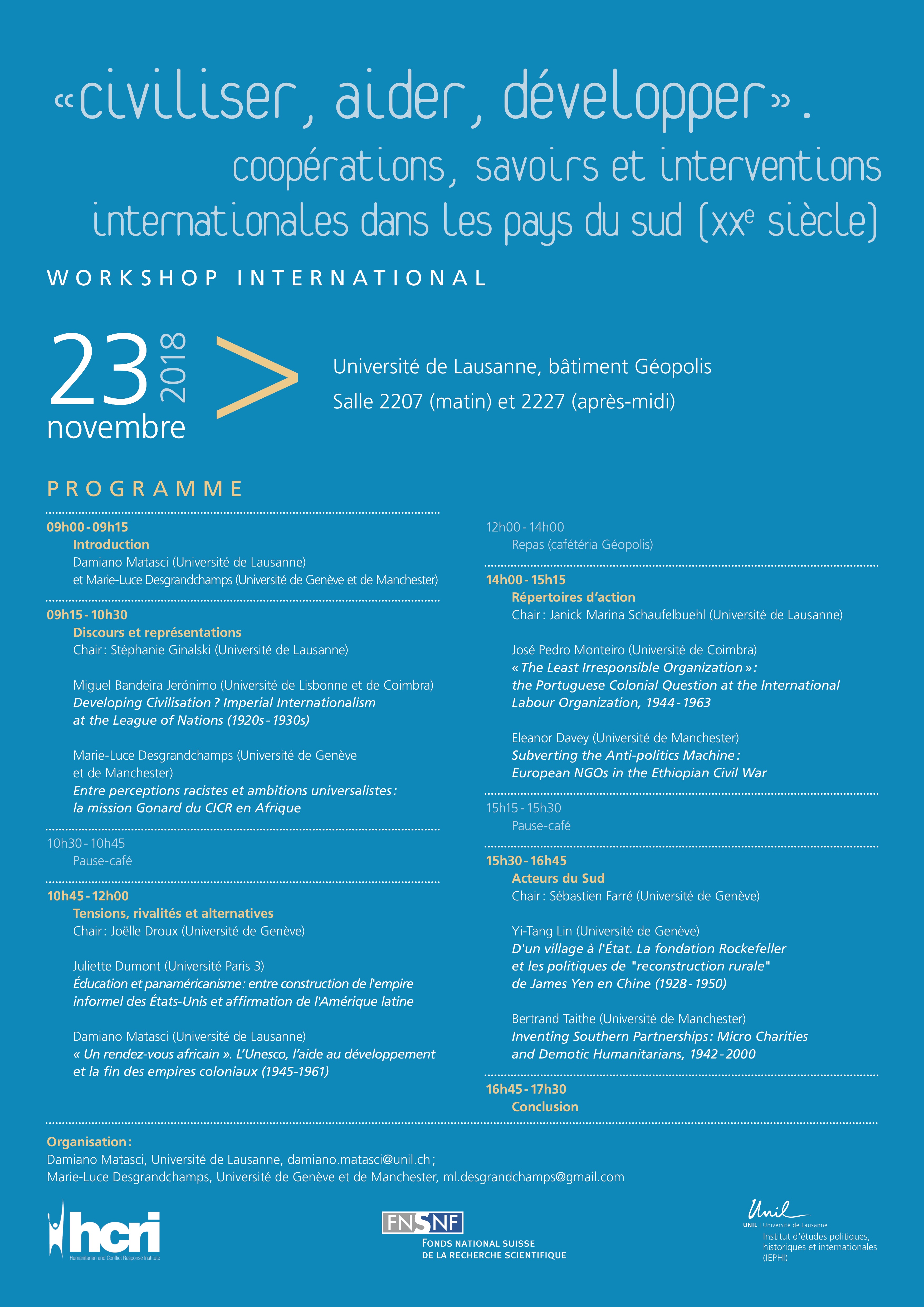 Workshop « Civiliser, aider, développer ». Coopérations, savoirs et interventions internationales dans les pays du Sud (XXe siècle), University of Lausanne, November 23, 2018. Co-organiser with Marie-Luce Desgrandchamps.